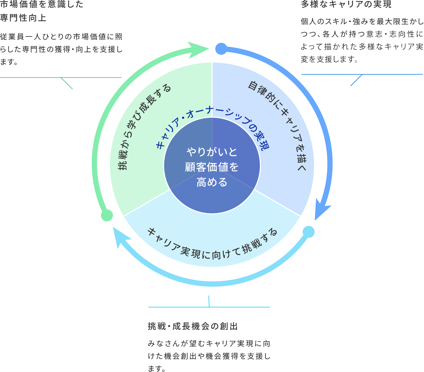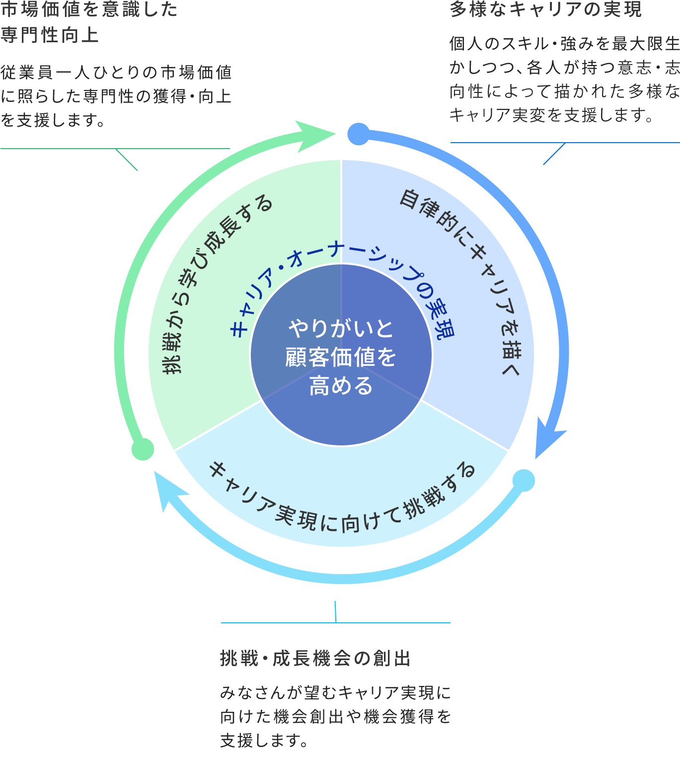 個人の成長を促すのと同時に、組織の壁を超えた人財の流動性を高め、知識・経験・能力の目に見えない多様性を受けいれる組織を目指します。