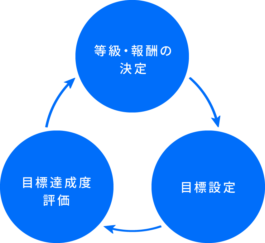 期首に等級に応じた目標設定を行い、期末に目標に対する結果(達成度)やプロセスを振り返り、評価を決定します。