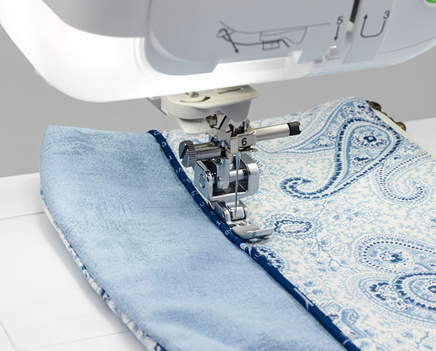 押えのガイドを調節すると布の厚さが変わってもきれいにまつりぬいすることができます。端ミシンをかける時やつき合わせぬいの時にも便利です。