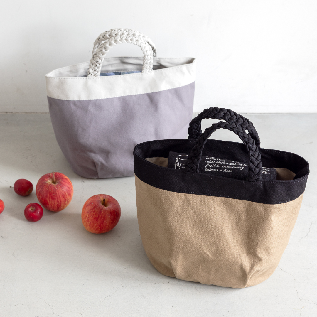 帆布を使用し、かごを思わせるころんとしたフォルムに仕上げたトートバッグ。