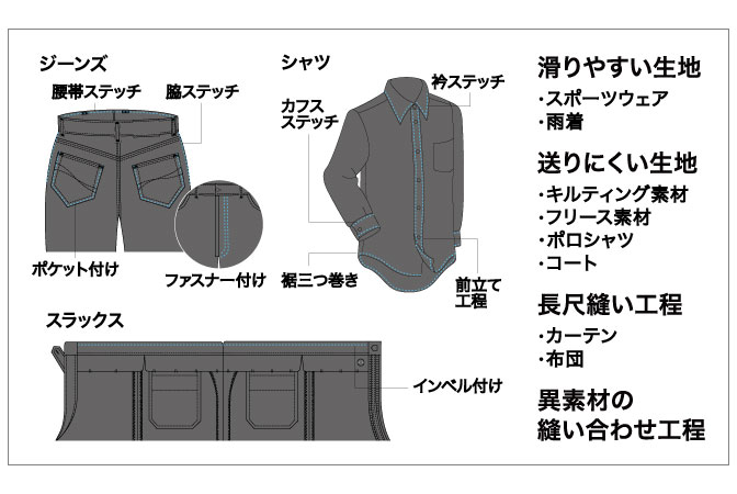 針送りミシンに適した生地、工程例