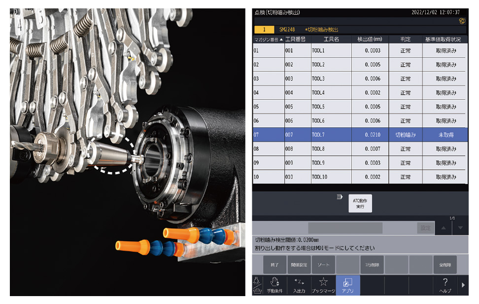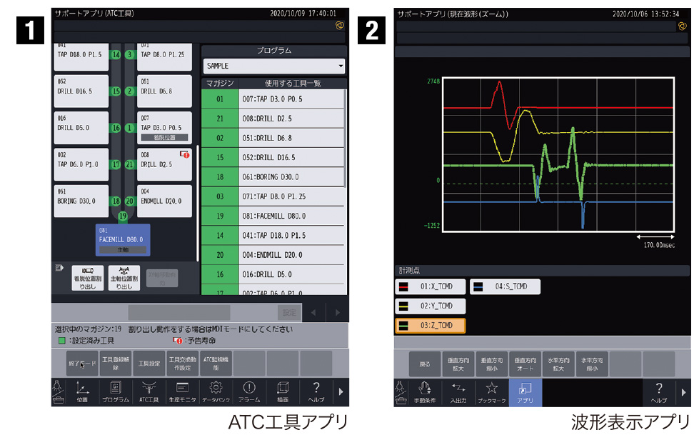 一画面でマガジン工具設定が全て行えるATC工具アプリ、教示面に従いNCプログラムを作れるメニュープログラミング機能、表示画面のヘルプ機能など、手間なく段取り作業が行えます。