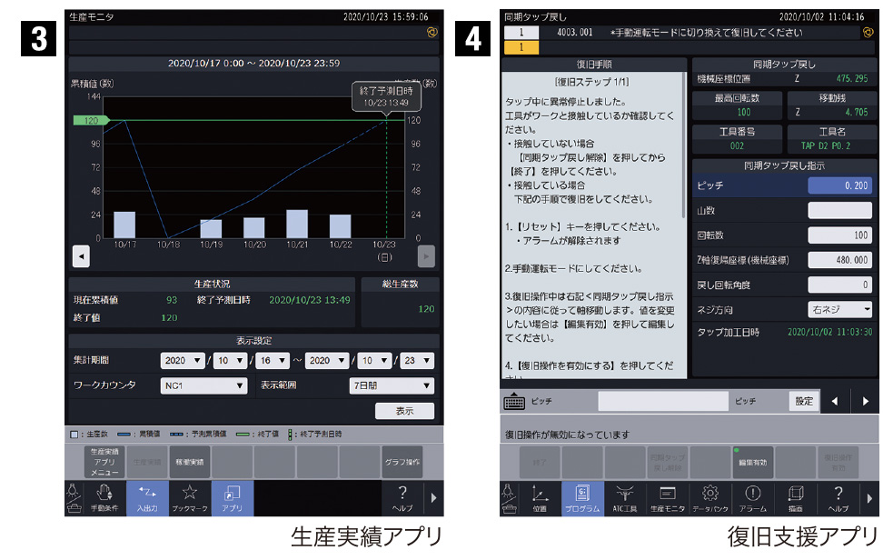 アプリ機能と縦置きタッチパネル式画面により直感的操作を実現しています。段取りや加工における関連機能を集約して効率的に操作し、生産や稼働の状況を視覚的に表示してスピーディーに把握します。段取り、加工調整、生産、復旧の各プロセスで、無駄のない作業を進めることができ、作業効率・稼働率アップに貢献します。