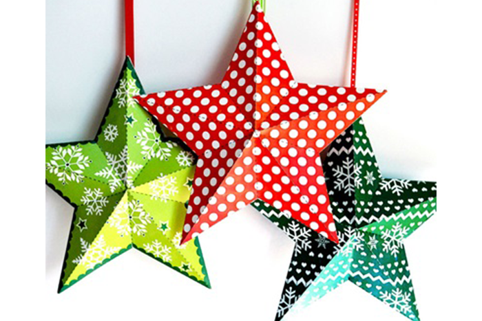 立体スターのモチーフは、2枚を合わせてリボンをつけるとクリスマスツリーにもぴったり。少し厚めの紙で作るとしっかりとしたオーナメントになります。