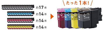 1本でブラックインクなら標準モデル*2対応のインクカートリッジ*3約17本分、カラーインクで約14本分のインク量を搭載。A4モノクロ文書なら約6,000ページ*4プリントできます。