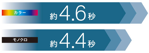AA4カラー普通紙 約4.6秒、A4モノクロ普通紙 約4.4秒のファーストプリント。