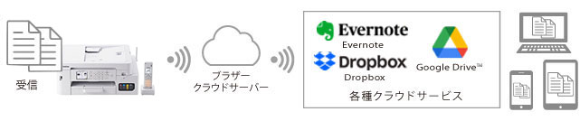 受信したファクスデータをEvernoteやDropboxなどクラウドを活用した各種ウェブサービスへ転送・保存することができます。受信したファクスは、保存先がクラウド環境の為、インターネットを経由して同僚と共有、外出先から確認も可能です。