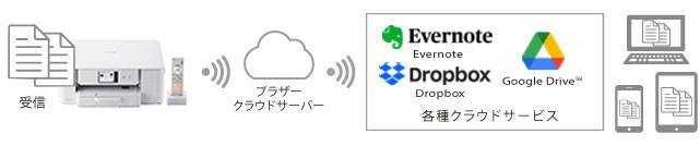 プリンターで受信した内容を、あらかじめ登録したEvernoteやDropboxなどのクラウド上に転送・保存できます。クラウド上に保存したファクスの内容は、インターネットを経由して他の人とも共有でき、外出先からも確認可能です。